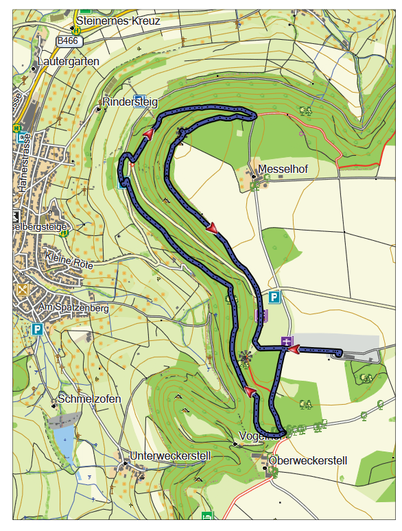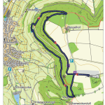 Hoch zum Messelstein, am Trauf entlang Richtung Flugplatz, ausgiebige Einkehr im Fliegerheim, dann eine Steige hinunter zurück zum Ausgangspunkt.